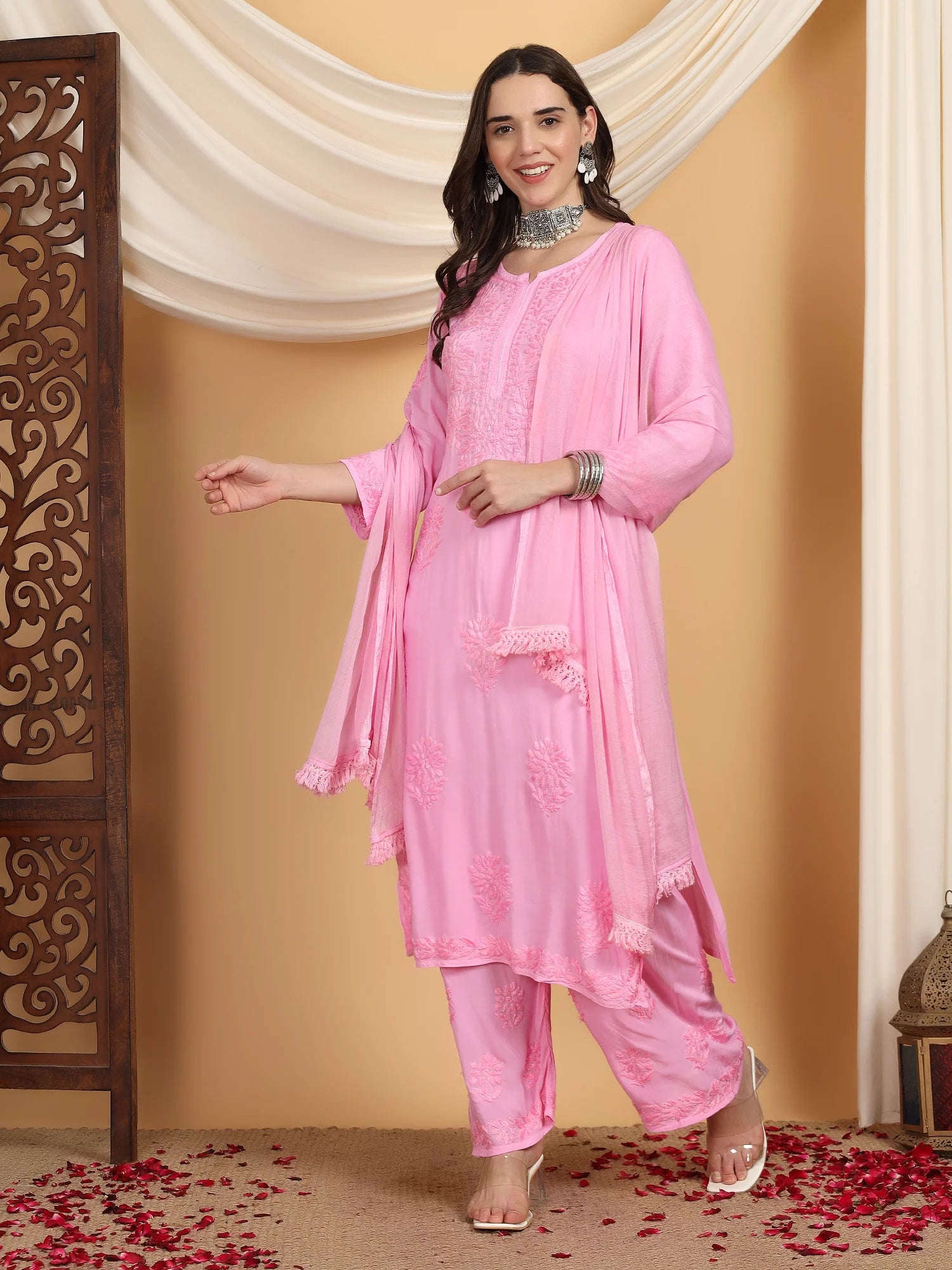 Workmanship: Hand-embroidery Chikankari Work includes Kurta plus palazzo trousers and a duvet.