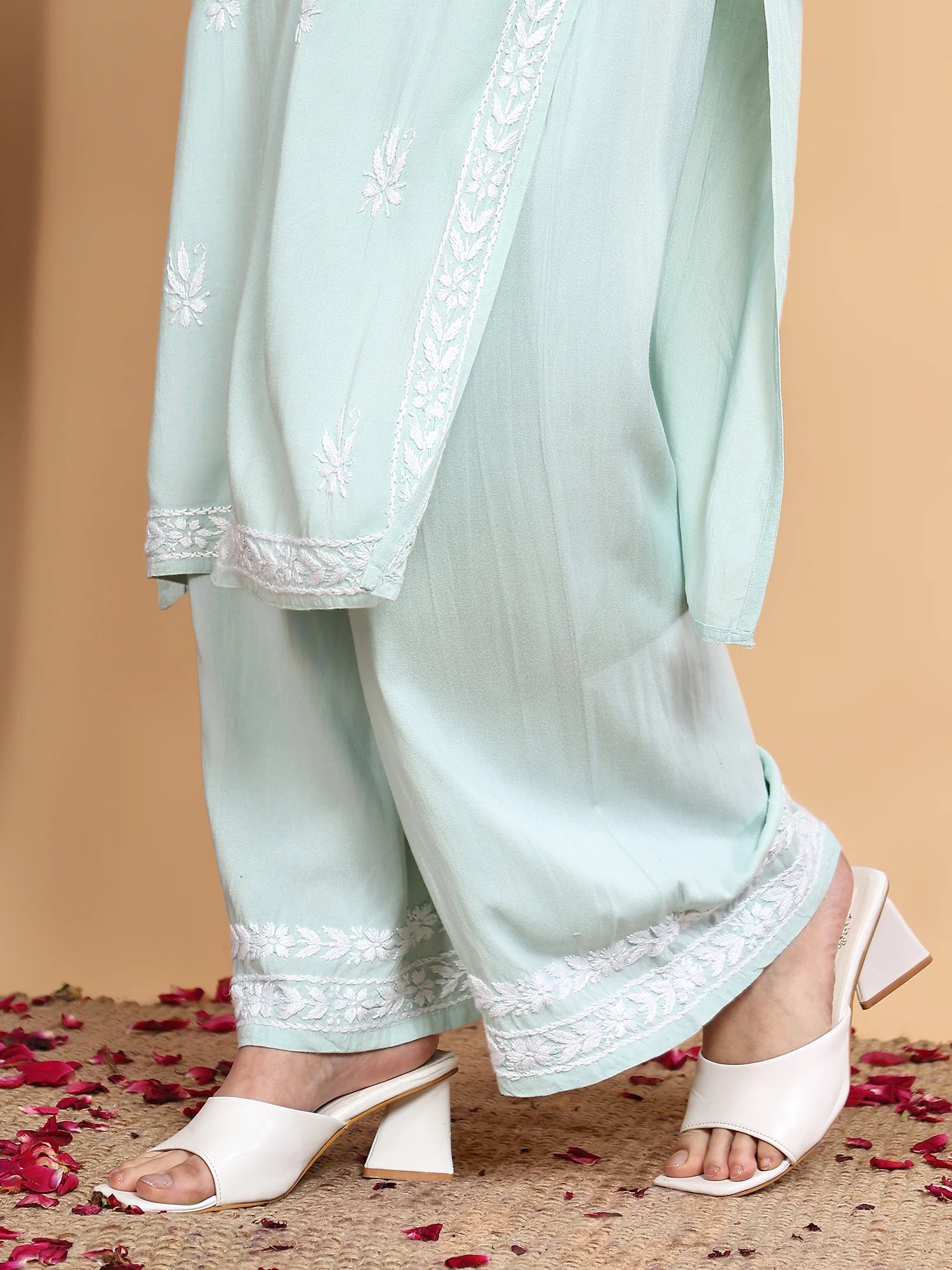 Achieve an effortless look with the Haya Chikankari Rayon Co-ord set which has a seamless fusion of traditional and contemporary style. Made of premium rayon fabric, this co-ord set is super comfortable and not heavily constricting, perfect for all day wear like in the office. The signature chikankari embroidery from Lucknow is lavishly embroidered on, which adds elegance and sophistication which makes it a stand out piece in your wardrobe. This outfit works wonders with minimal work for sundry events whether it be brunch, festive as well as casual events.