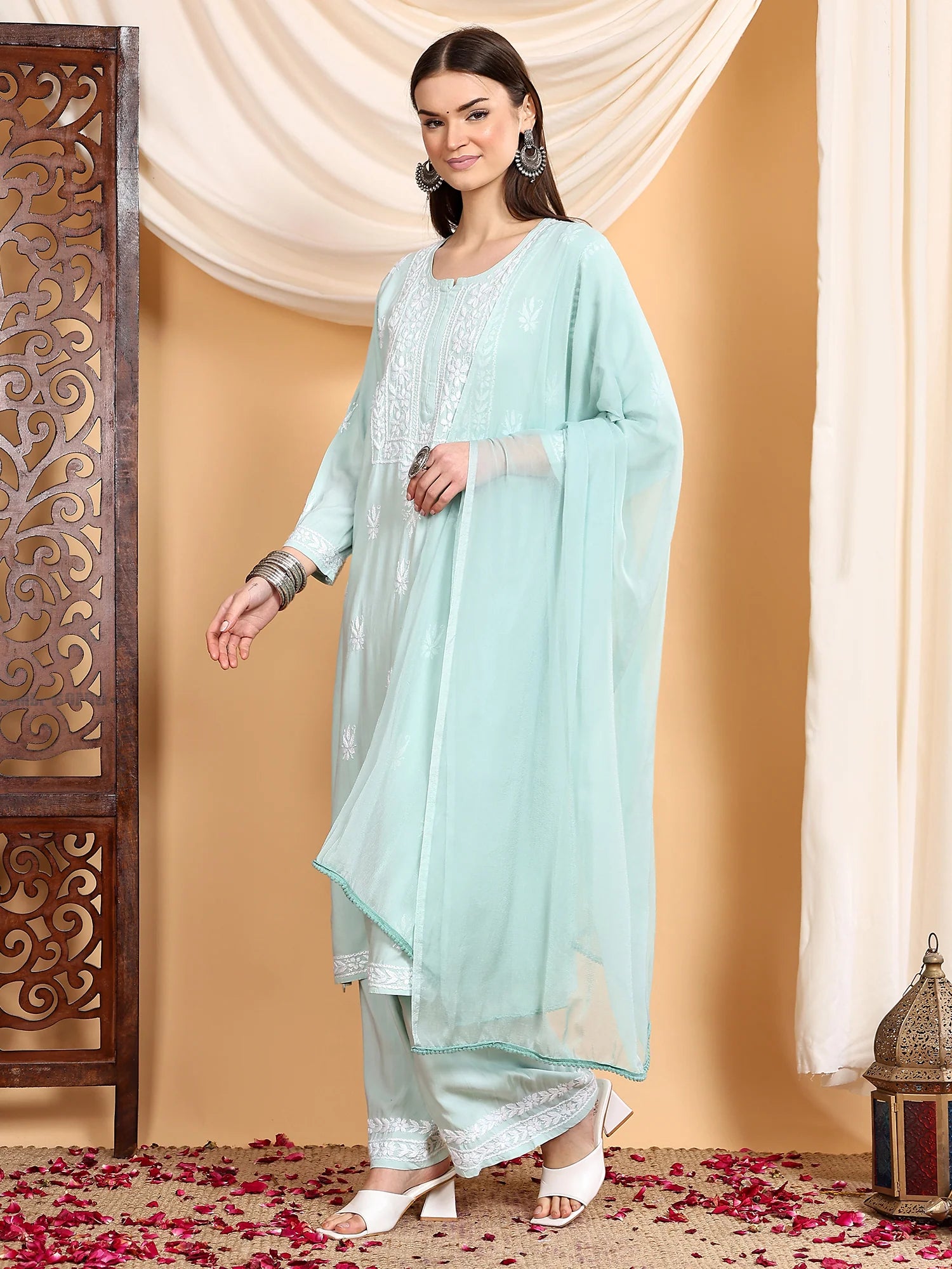 Festive wear chikankari 3 piece co-ord set with exquisite hand embroidered motifs, perfect outfit for any occasion.