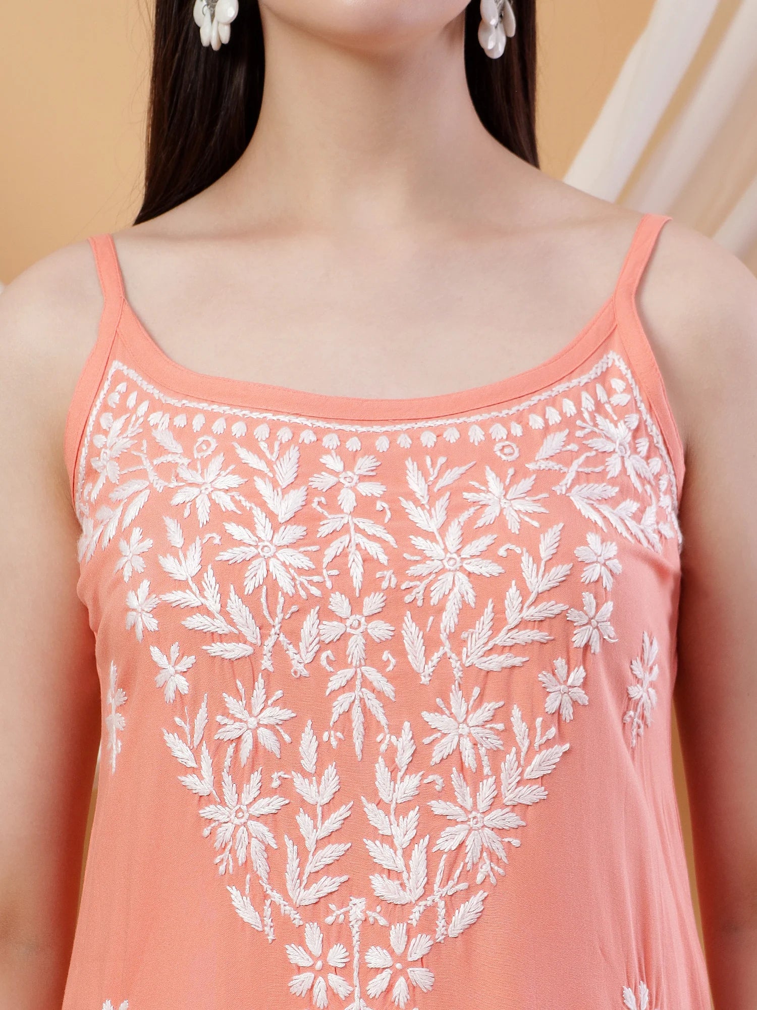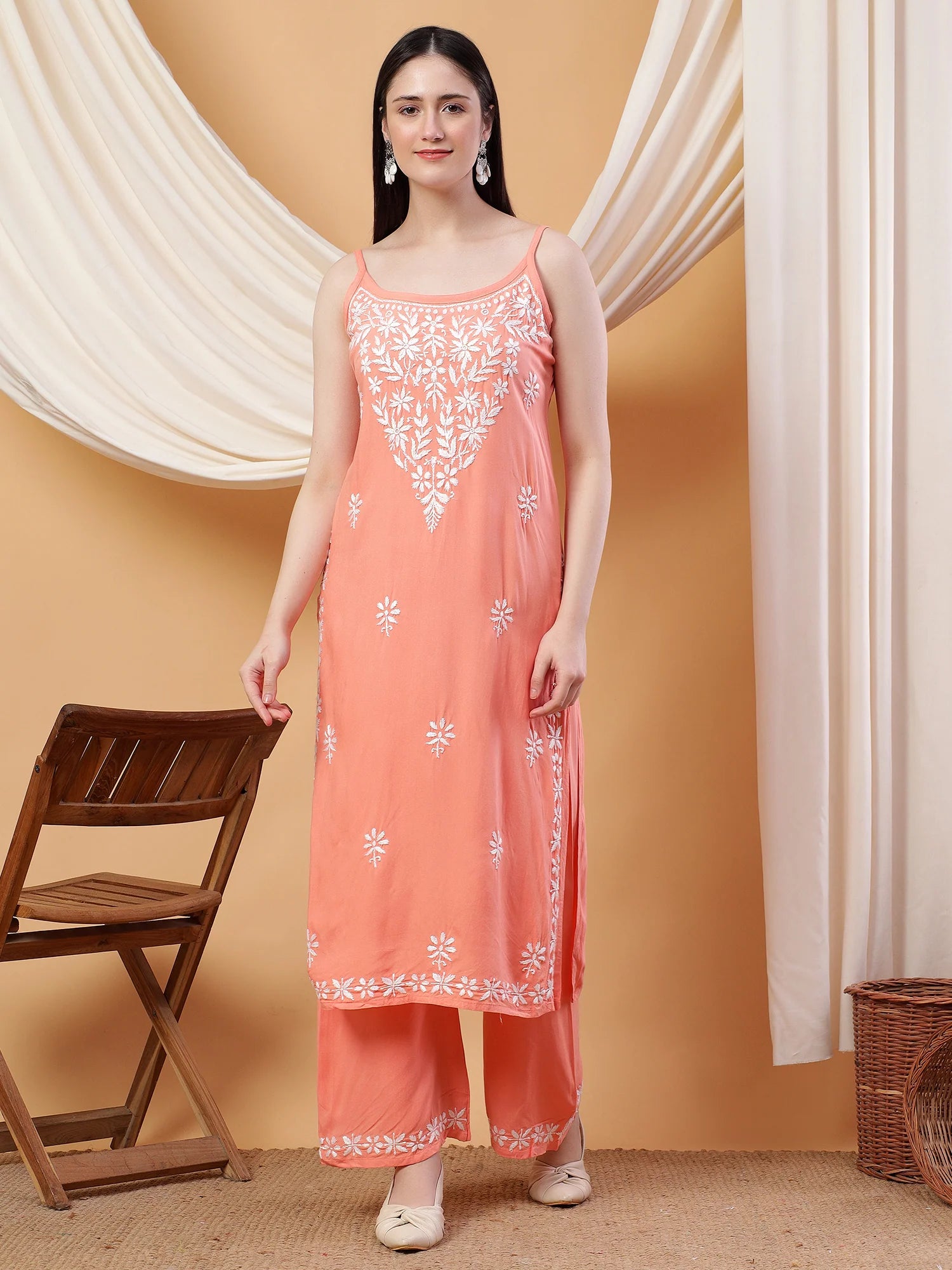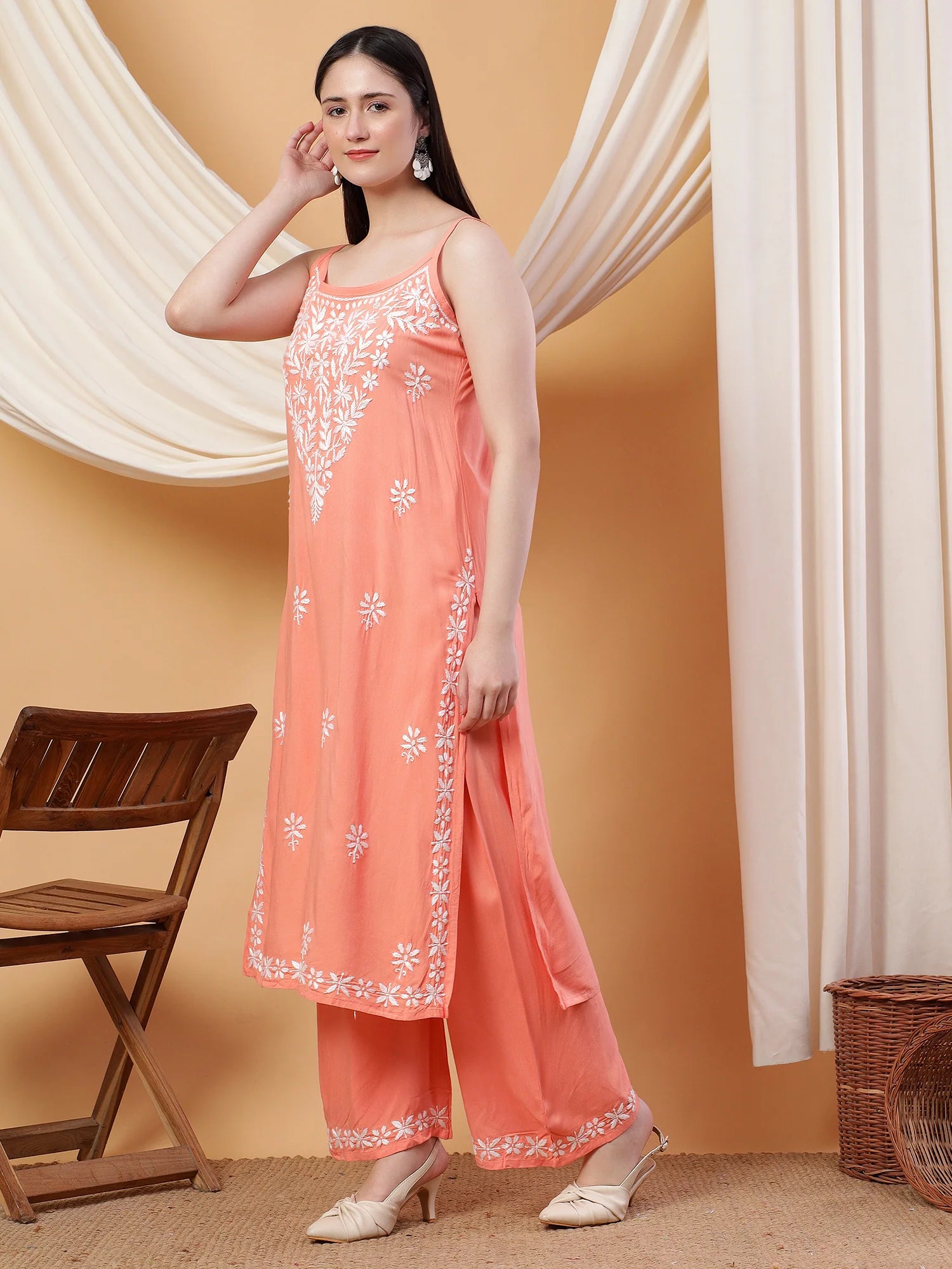 Raha Chikankari Strappy Rayon Co-ord Set (Peach)
