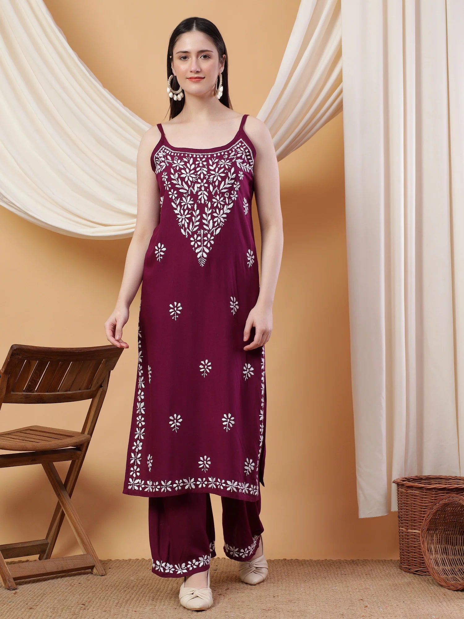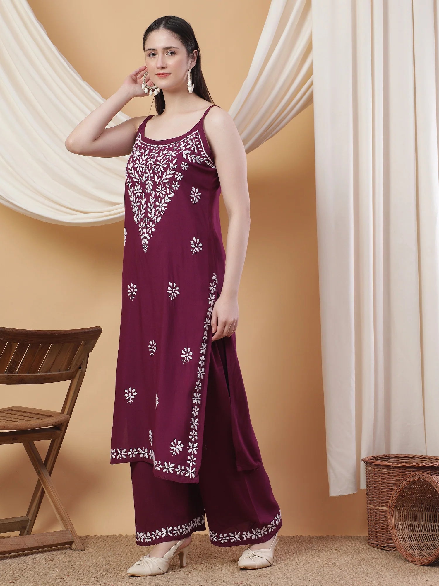 Raha Chikankari Strappy Rayon Co-ord Set (Wine)