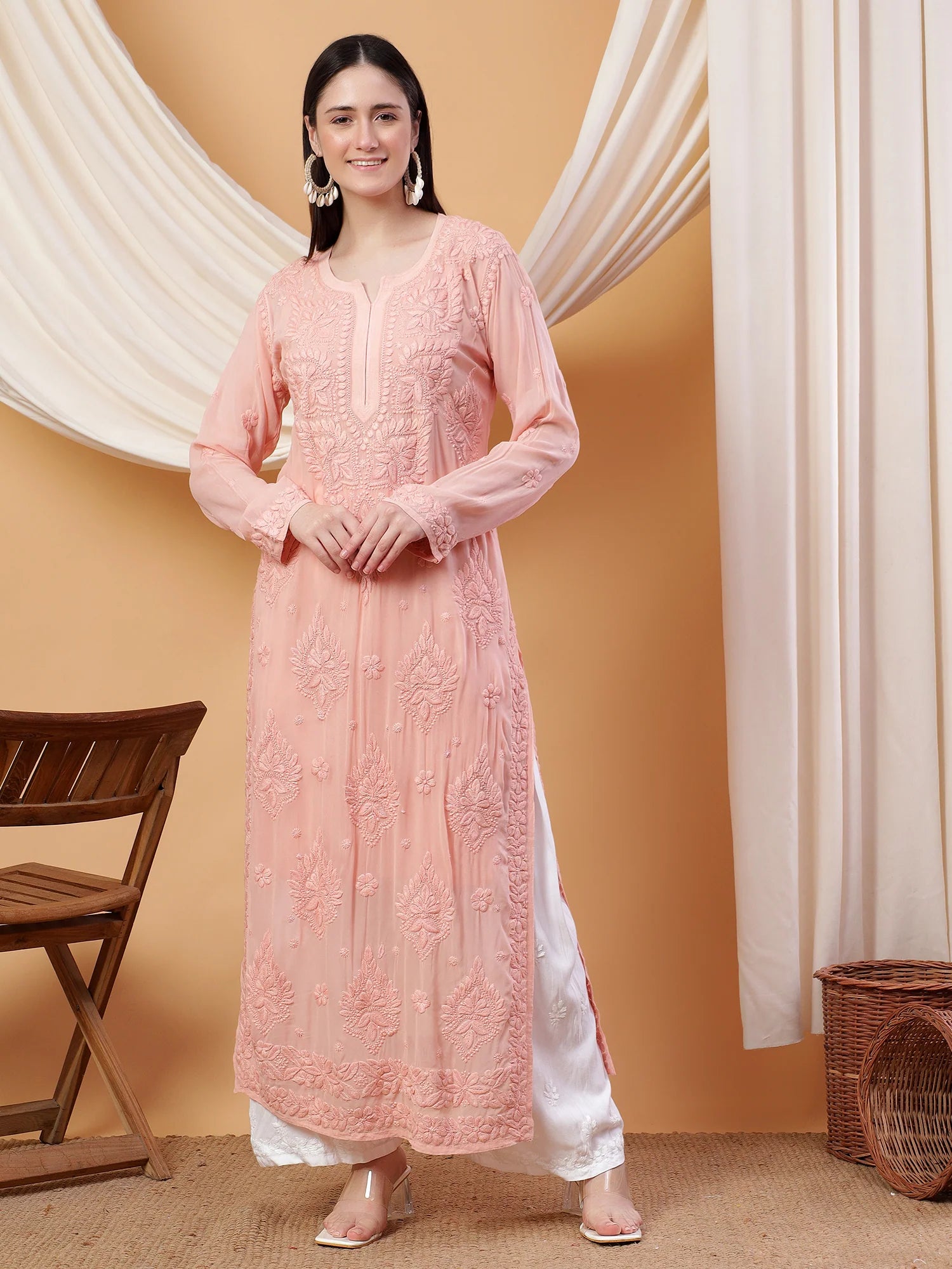 • Handcrafted Details Authentic chikan kurta embroidery, featuring floral motifs and geometric patterns.