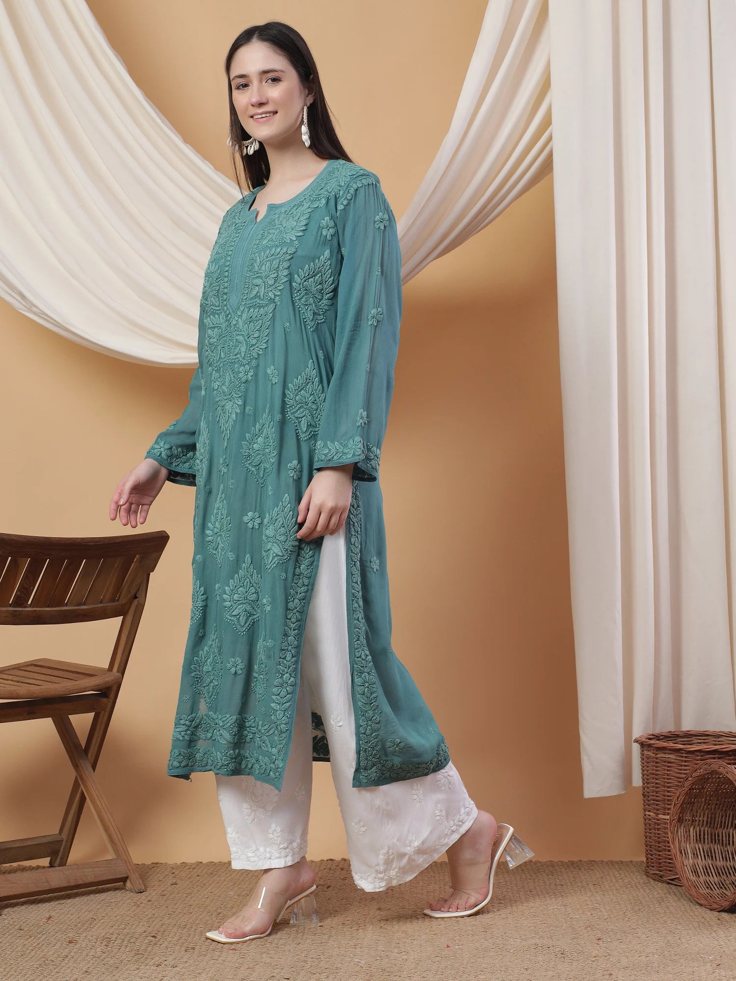 Handcrafted Details : Authentic chikan kurta embroidery, featuring floral motifs and geometric patterns.