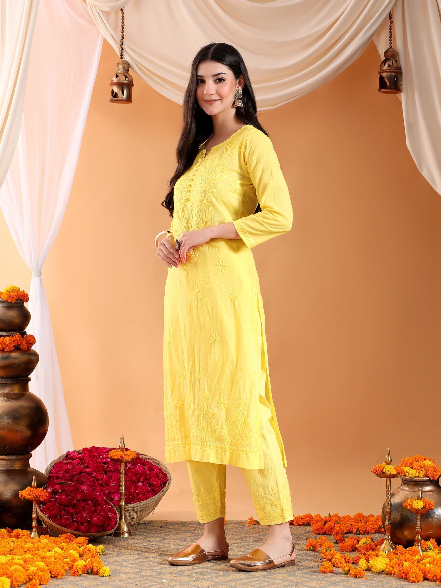Ananya Chikankari Kurta Pant Cotton Co-ord Set (Yellow)