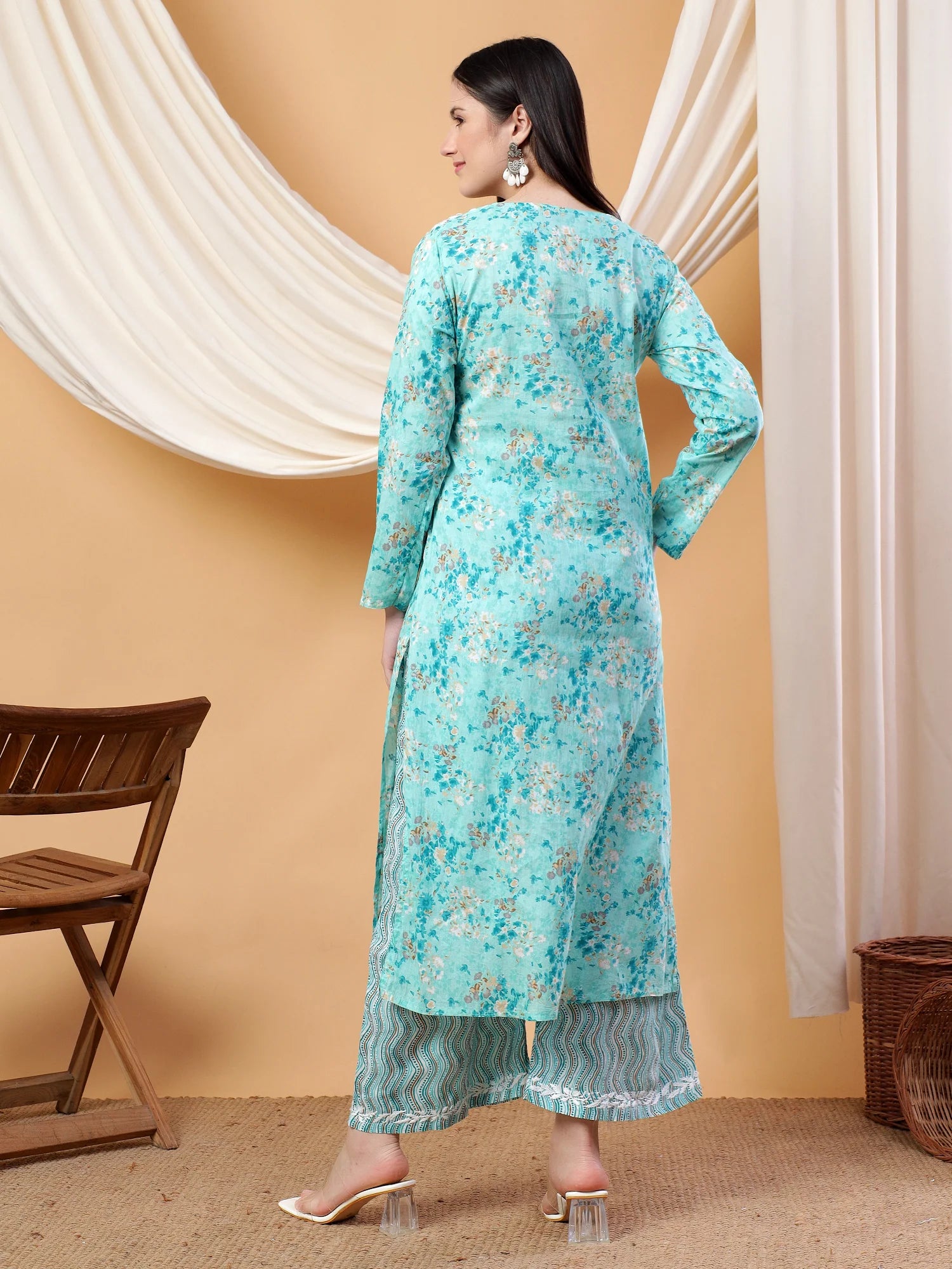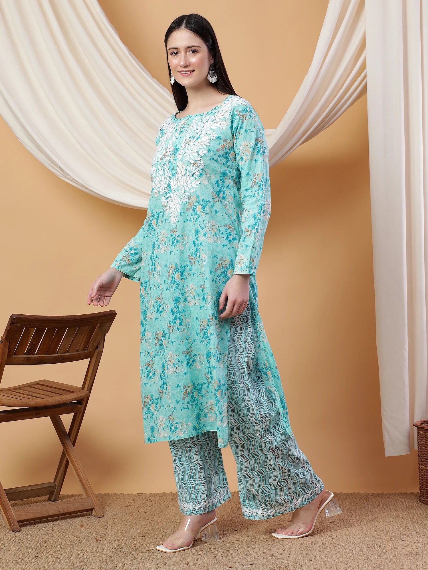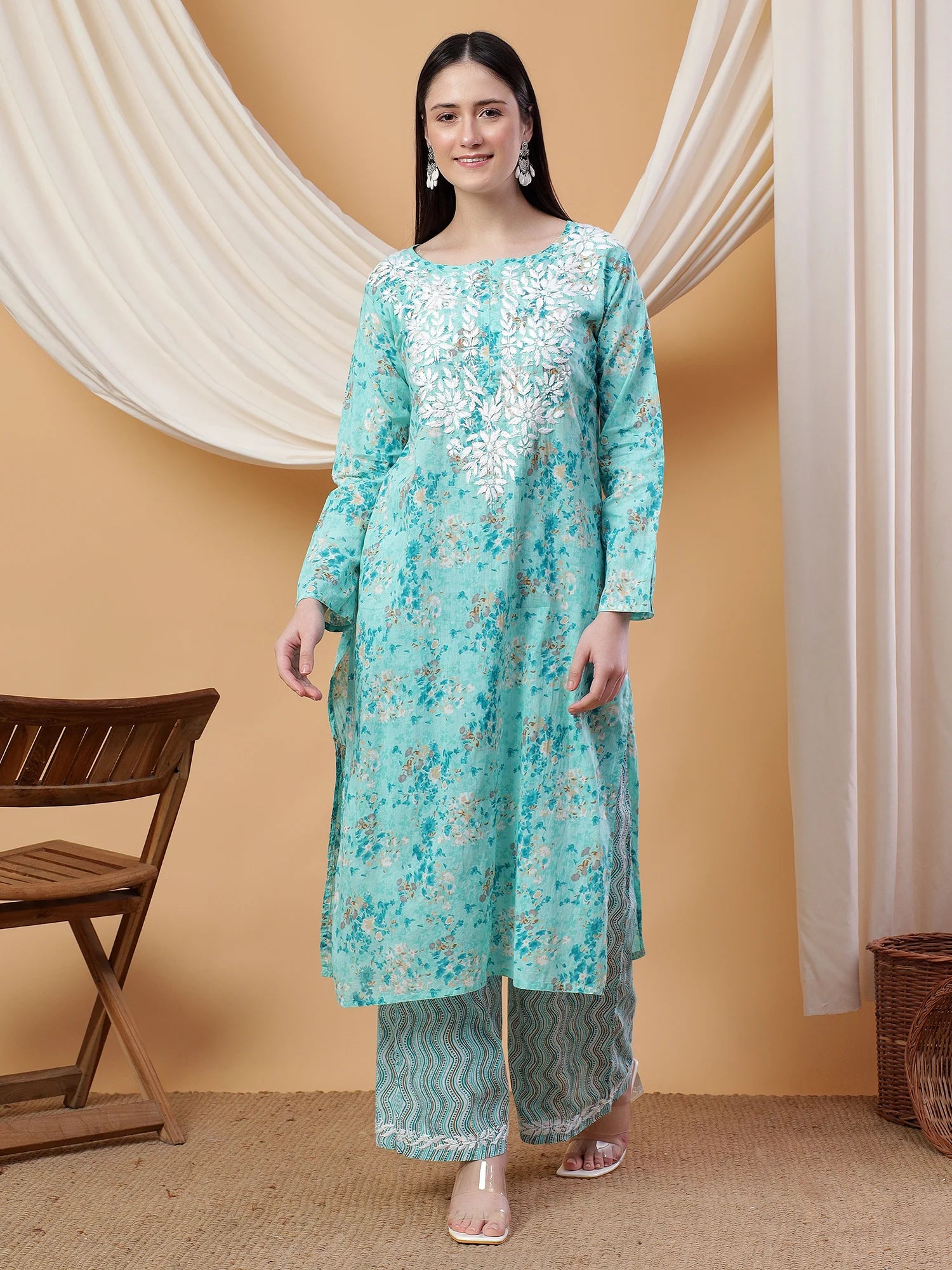 Newly launched party wear straight kurta and palazzo co-ord set with handcrafted chikankari and floral prints.
