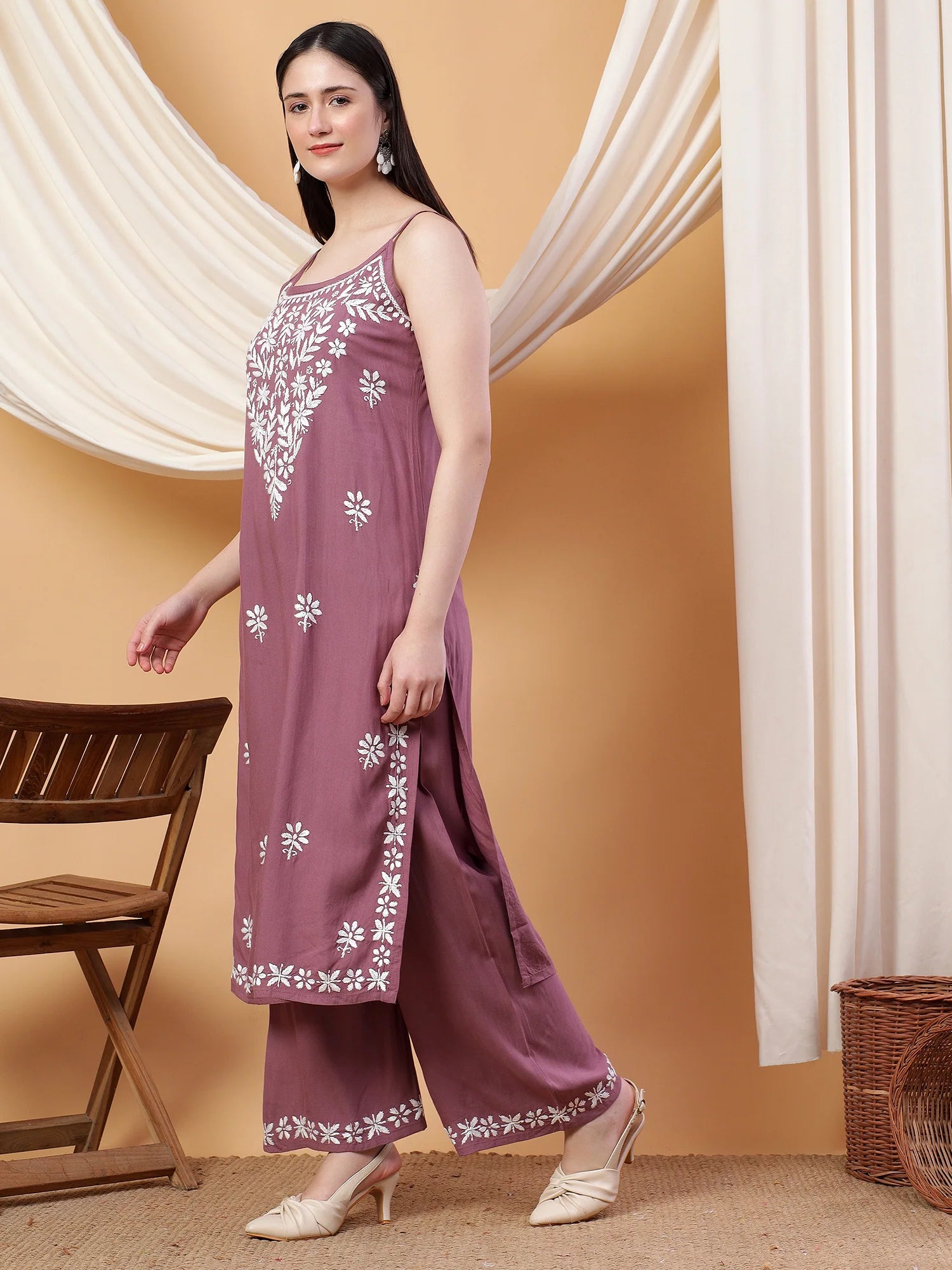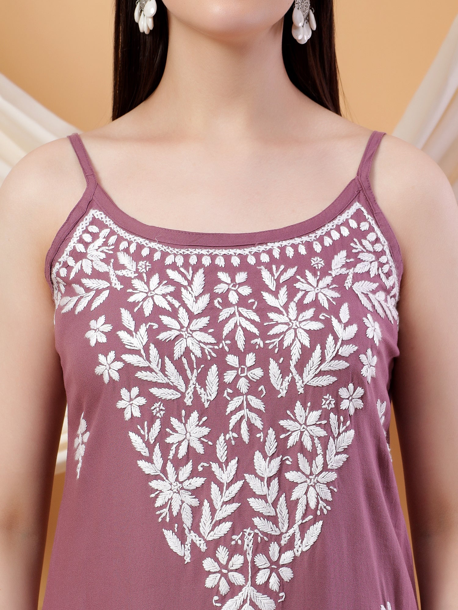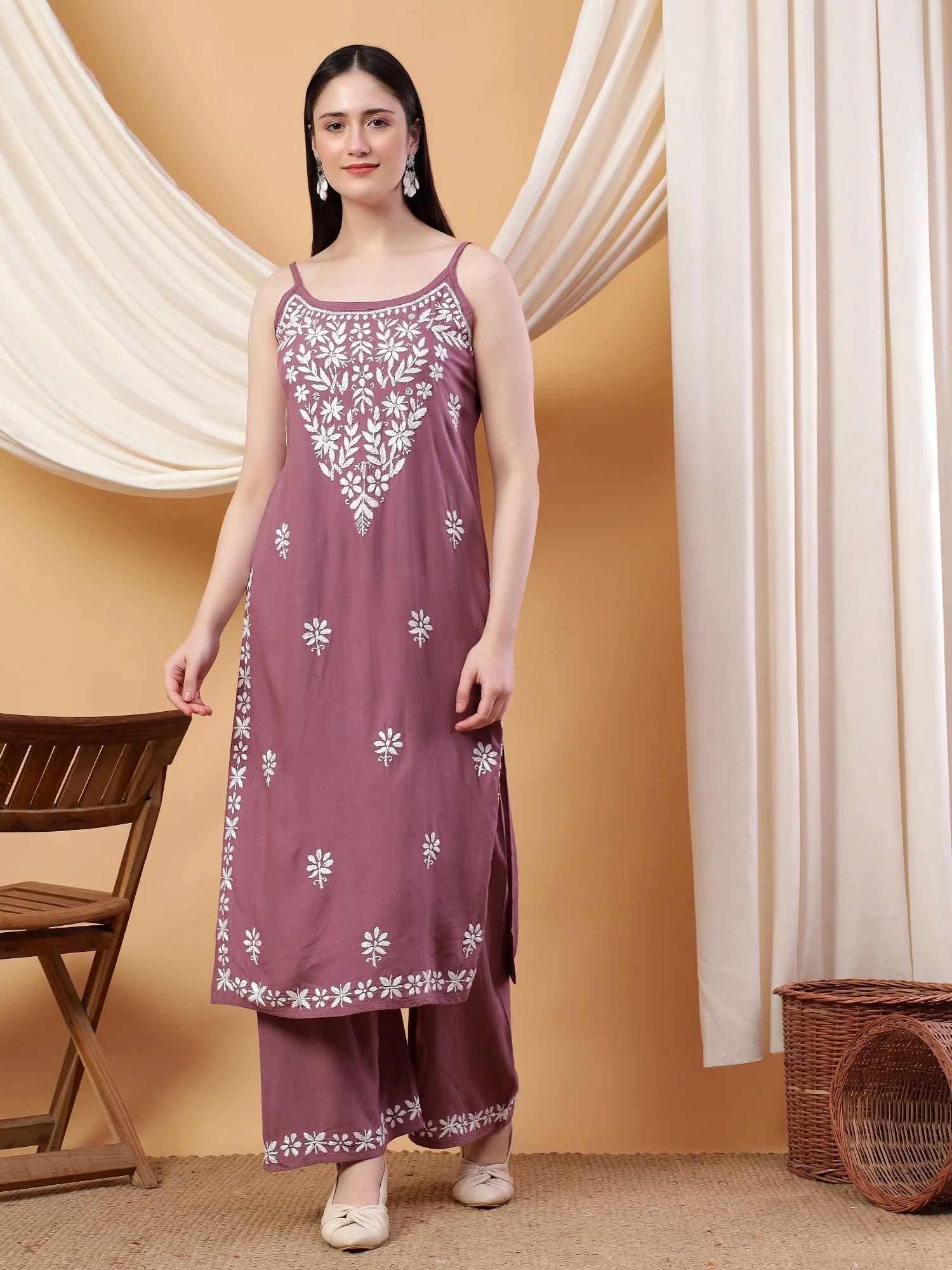 Raha Chikankari Strappy Rayon Co-ord Set (Mauve)