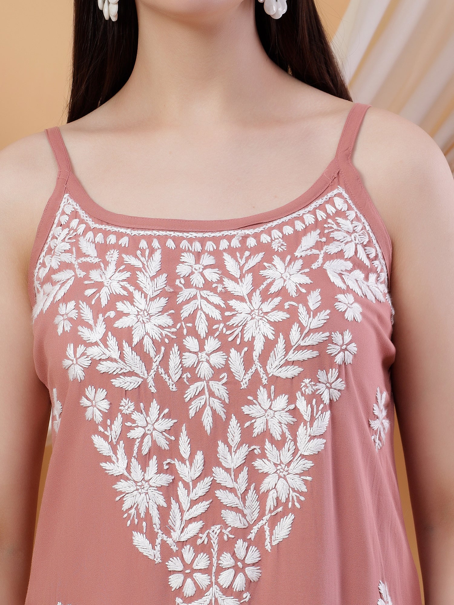 Trendy noodle strap chikankari co-ord set with exquisite hand embroidered motifs, perfect outfit for any occasion.