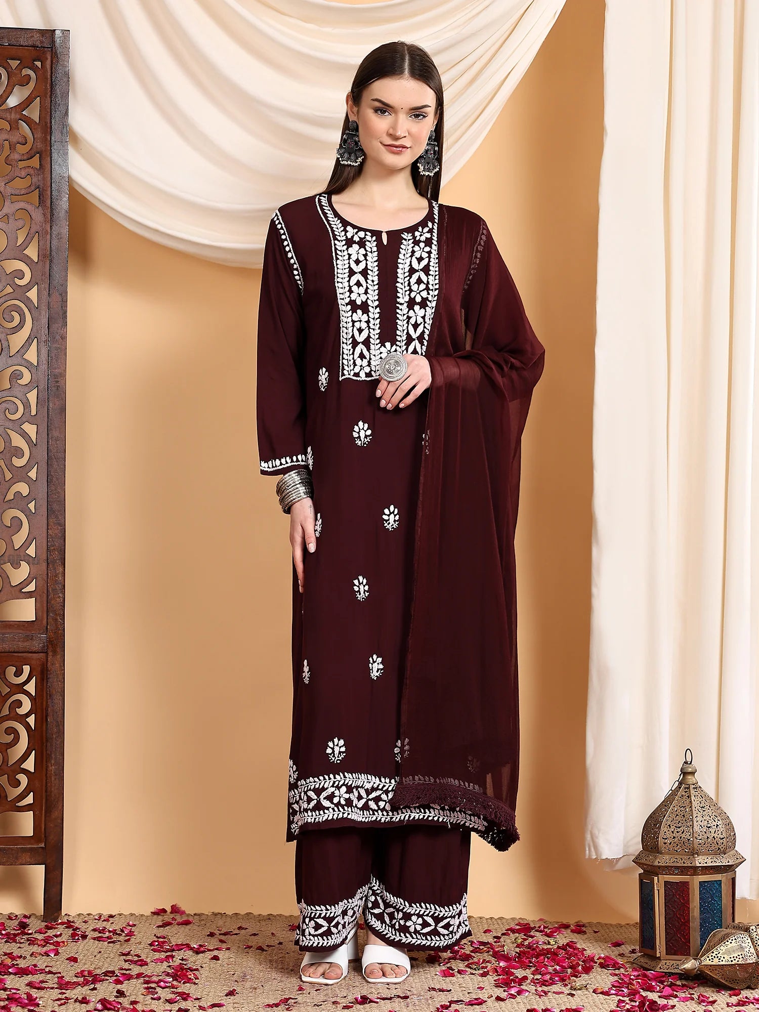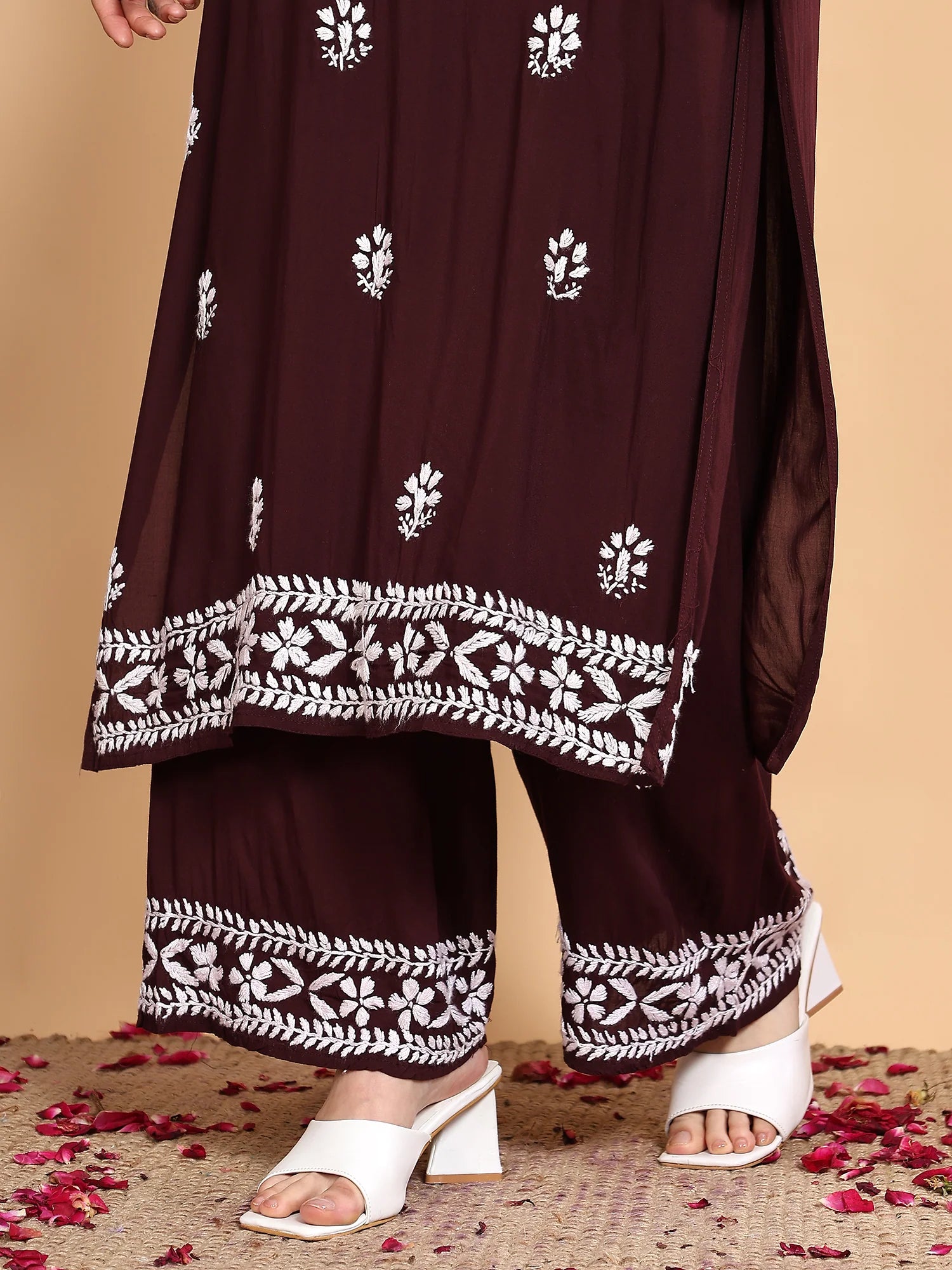 Workmanship: Hand-embroidery Chikankari Work includes Kurta plus palazzo trousers and a duvet.