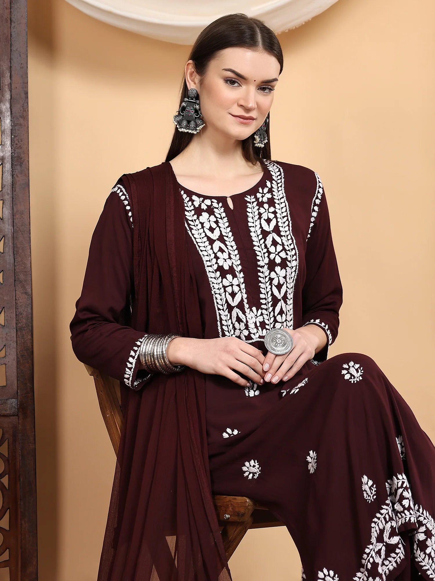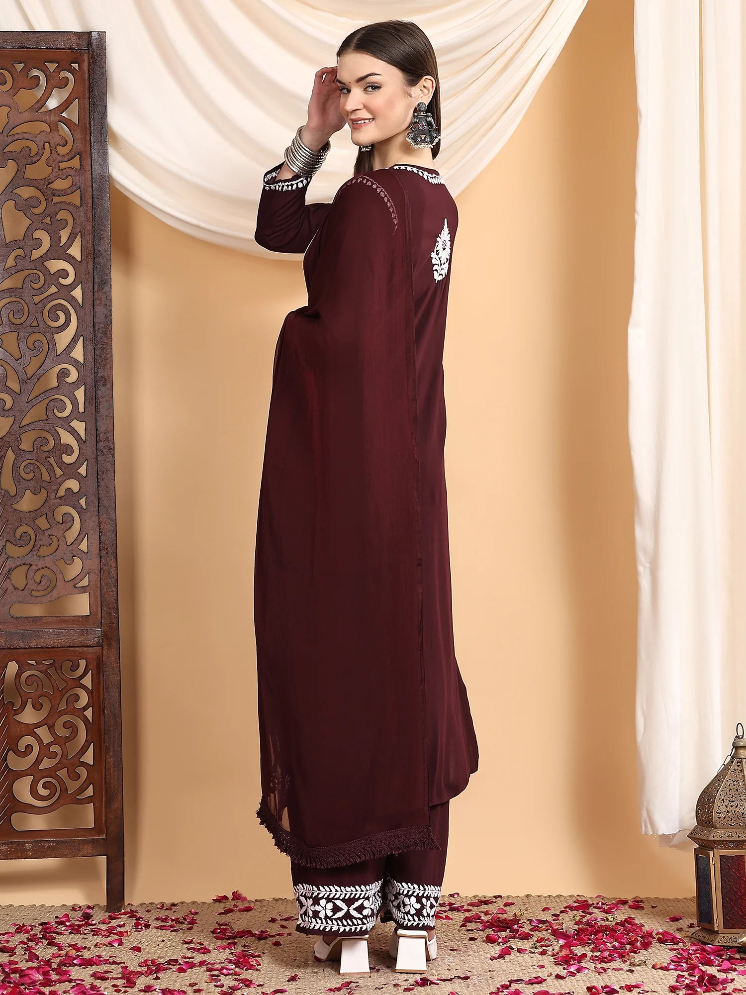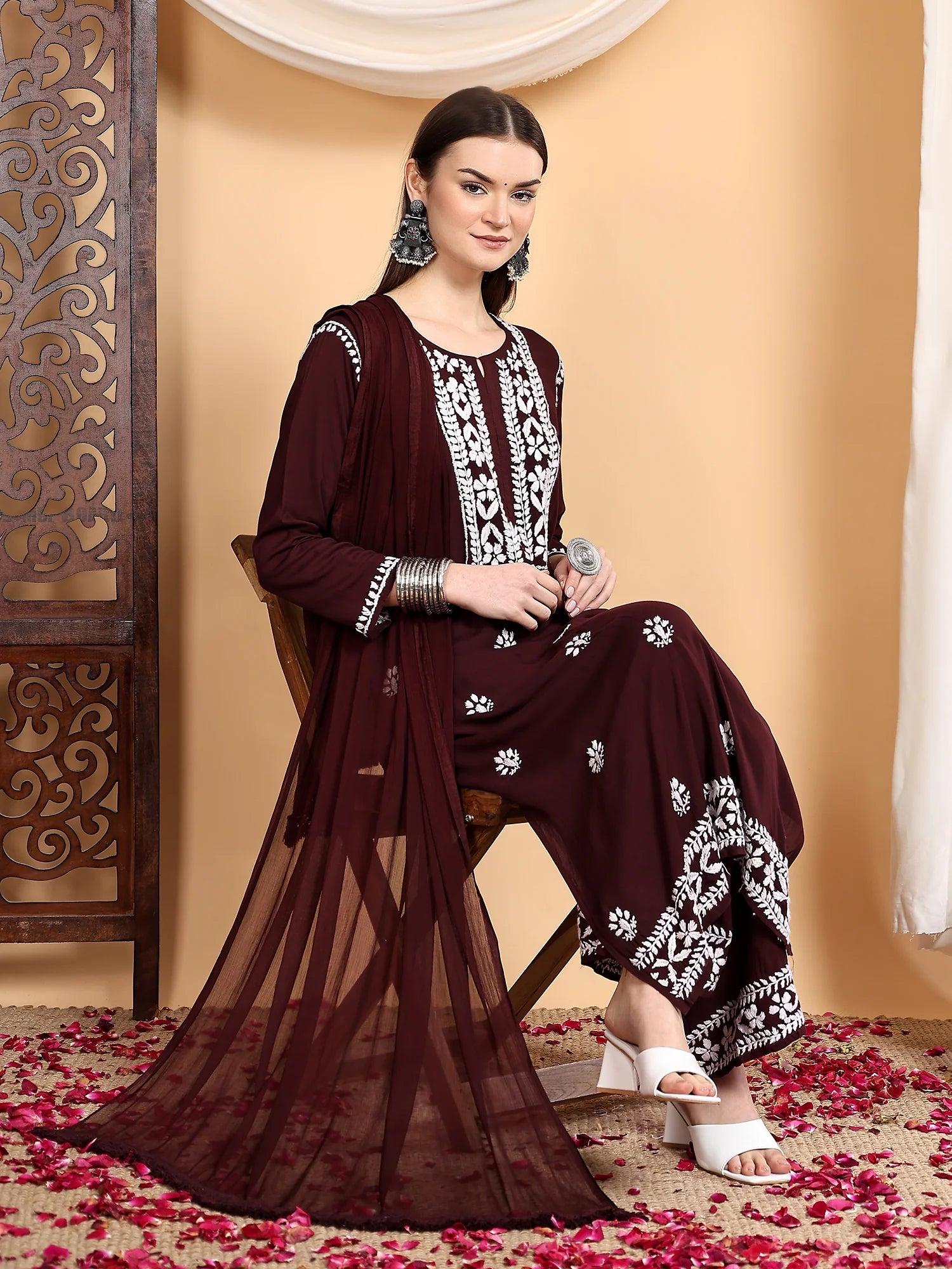 Beautiful handcrafted chikankari embroidery adorns this ensemble, therefore highlighting the rich legacy of Indian creativity. Every thread shows painstaking attention to detail, which accentuates your appearance.