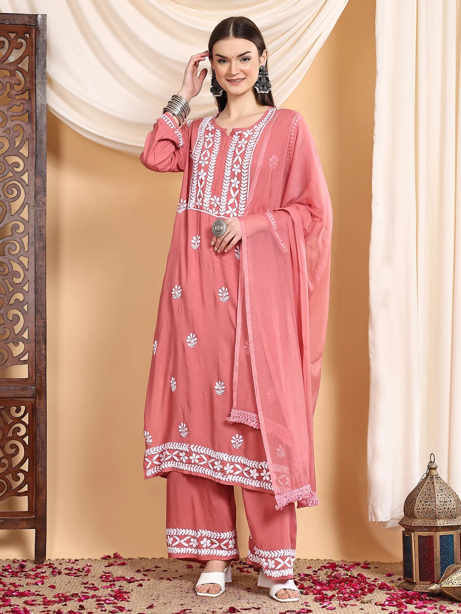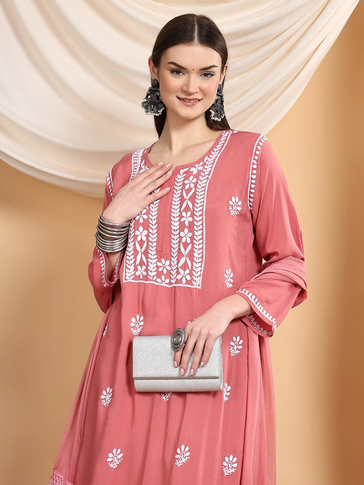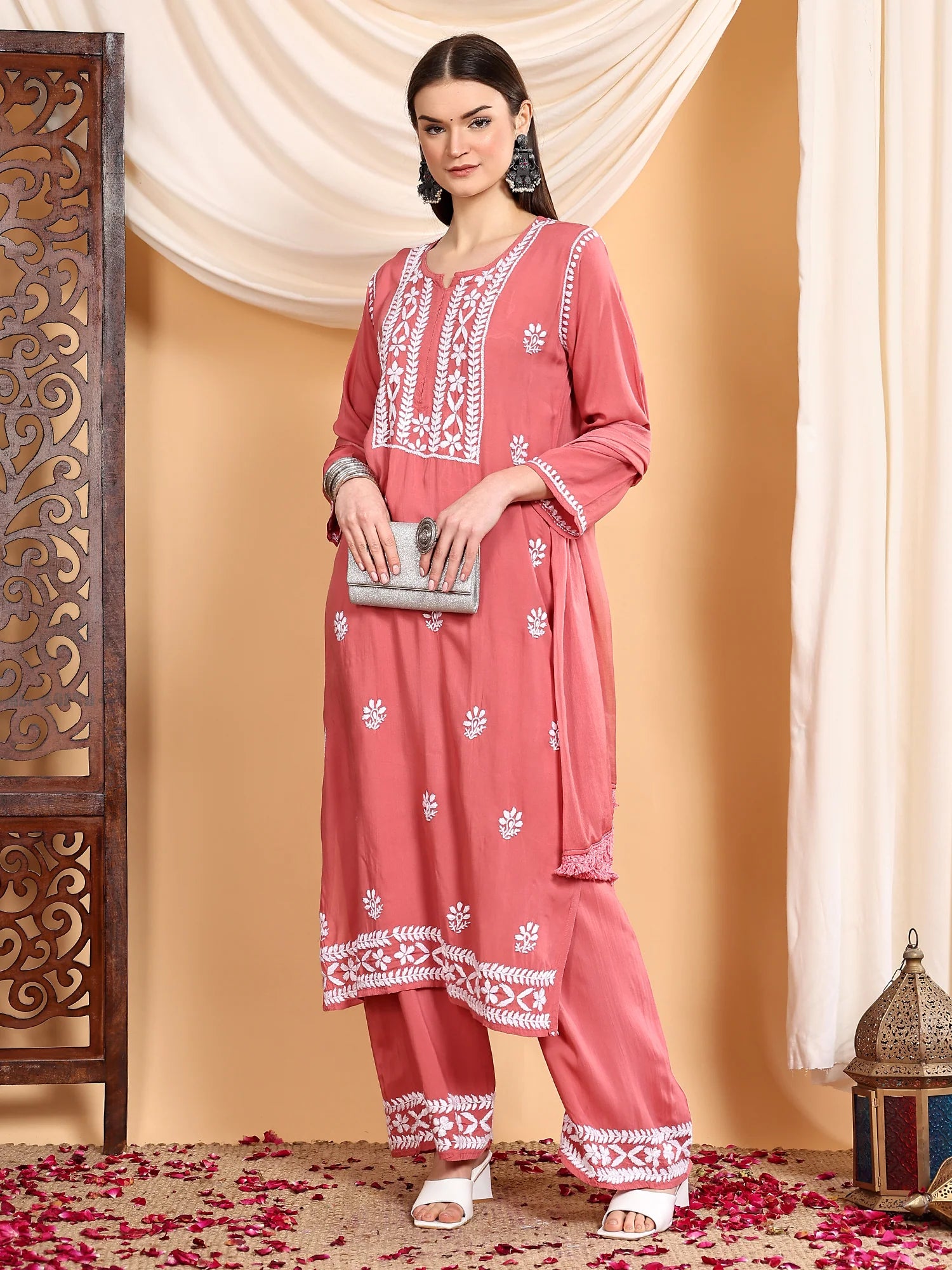 Shiza Chikankari Premium Modal Co-ord Set (Coral Pink)