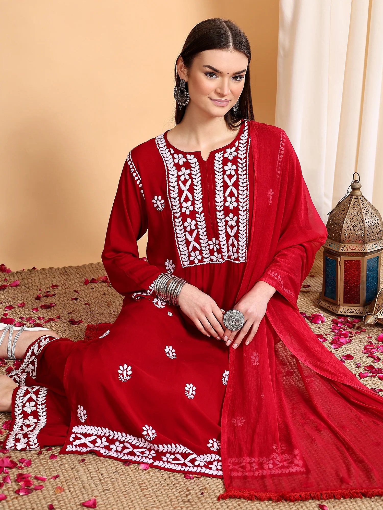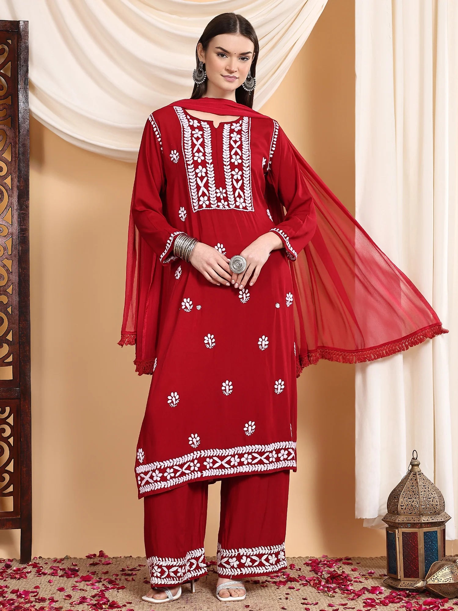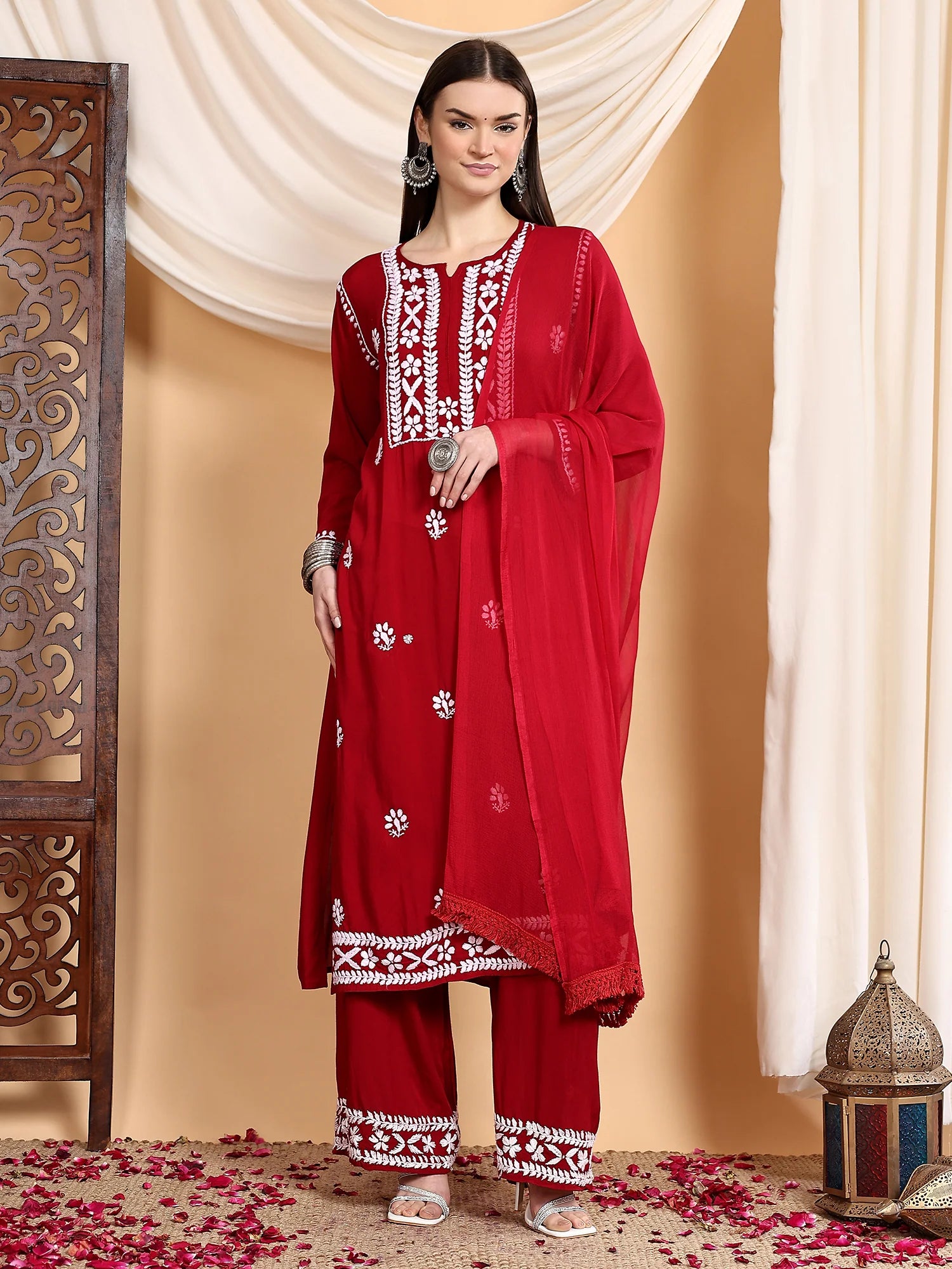Workmanship: Hand-embroidery Chikankari Work includes Kurta plus palazzo trousers and a duvet.