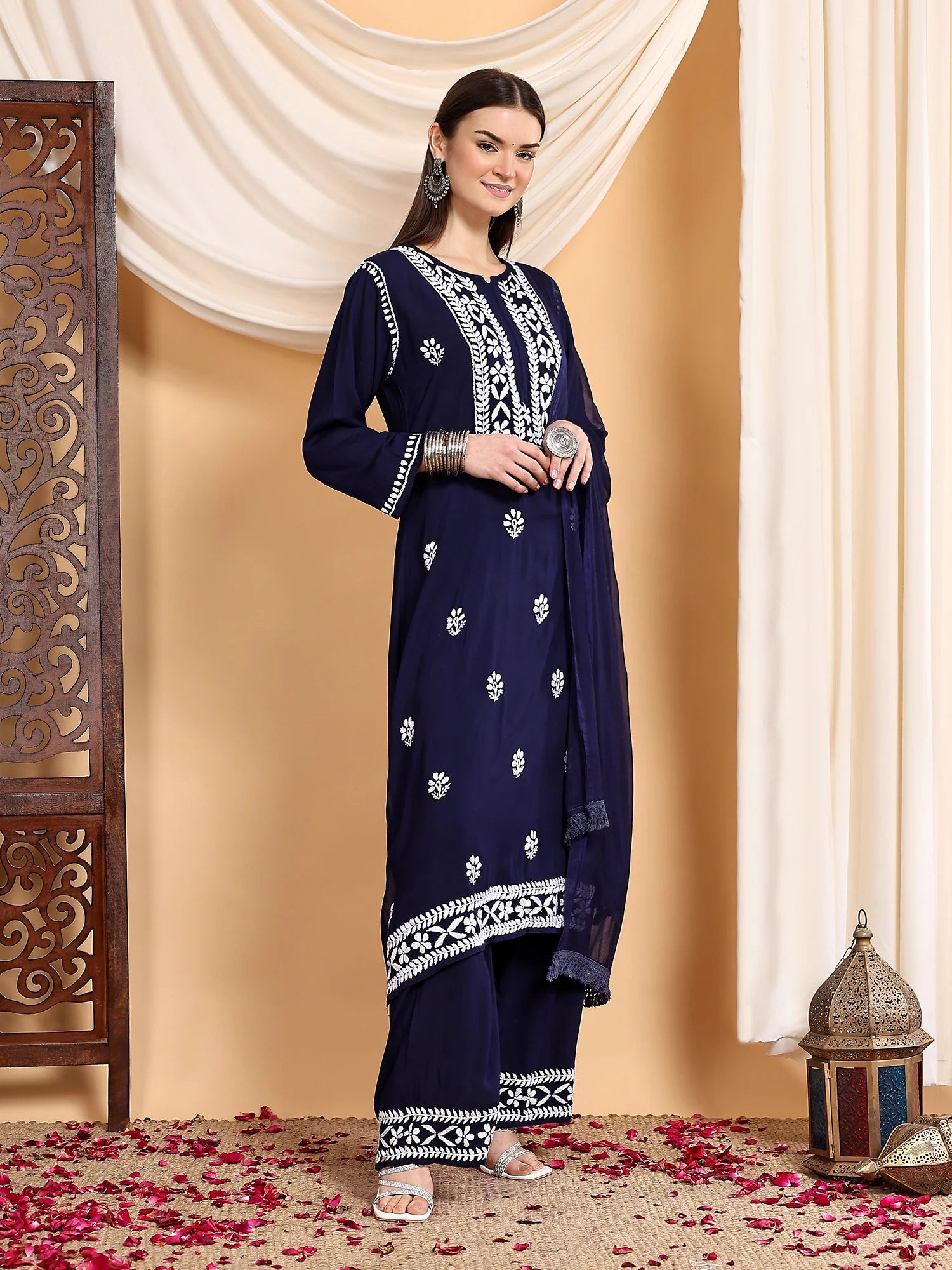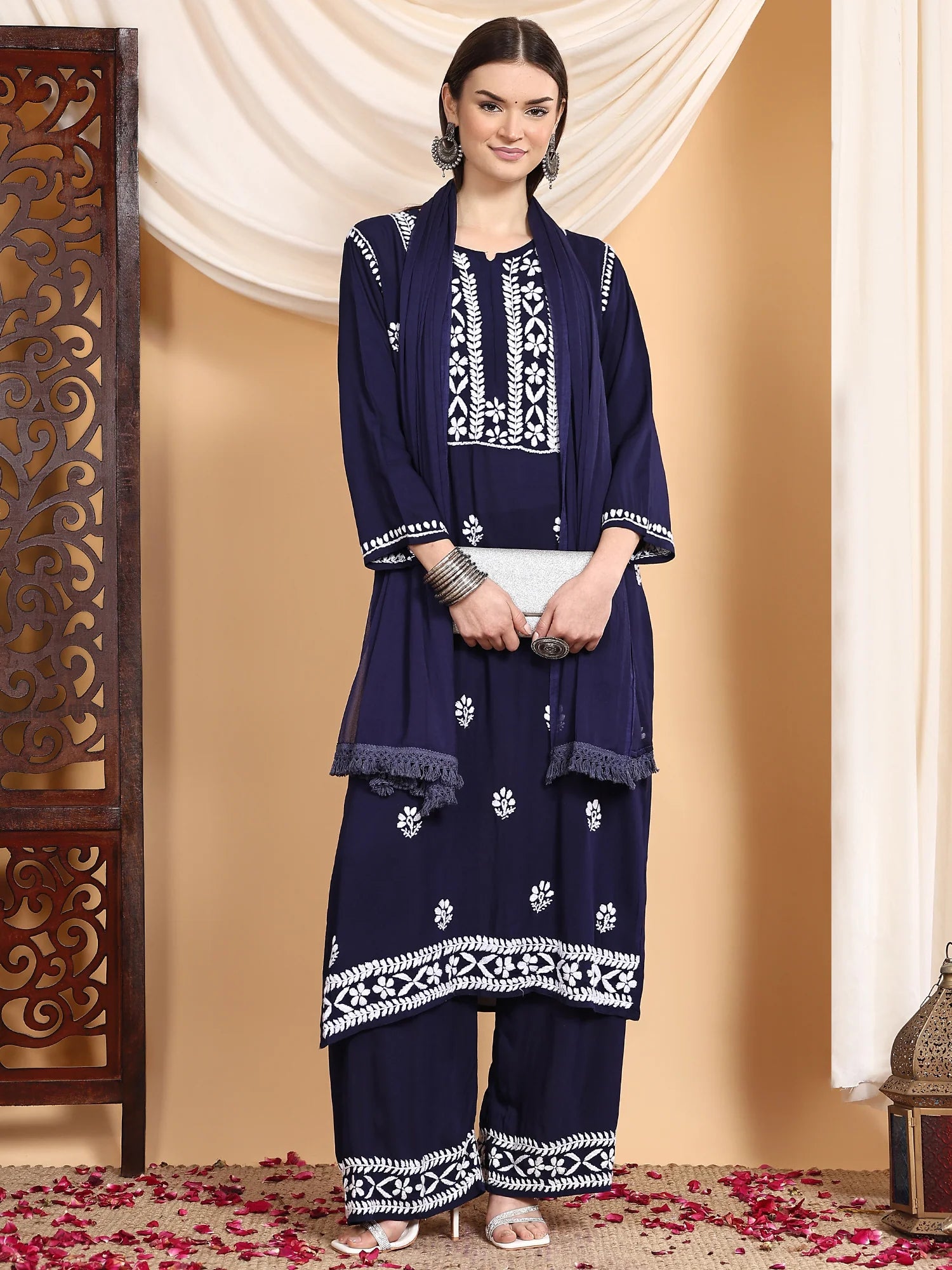 Workmanship: Hand-embroidery Chikankari Work includes Kurta plus palazzo trousers and a duvet.