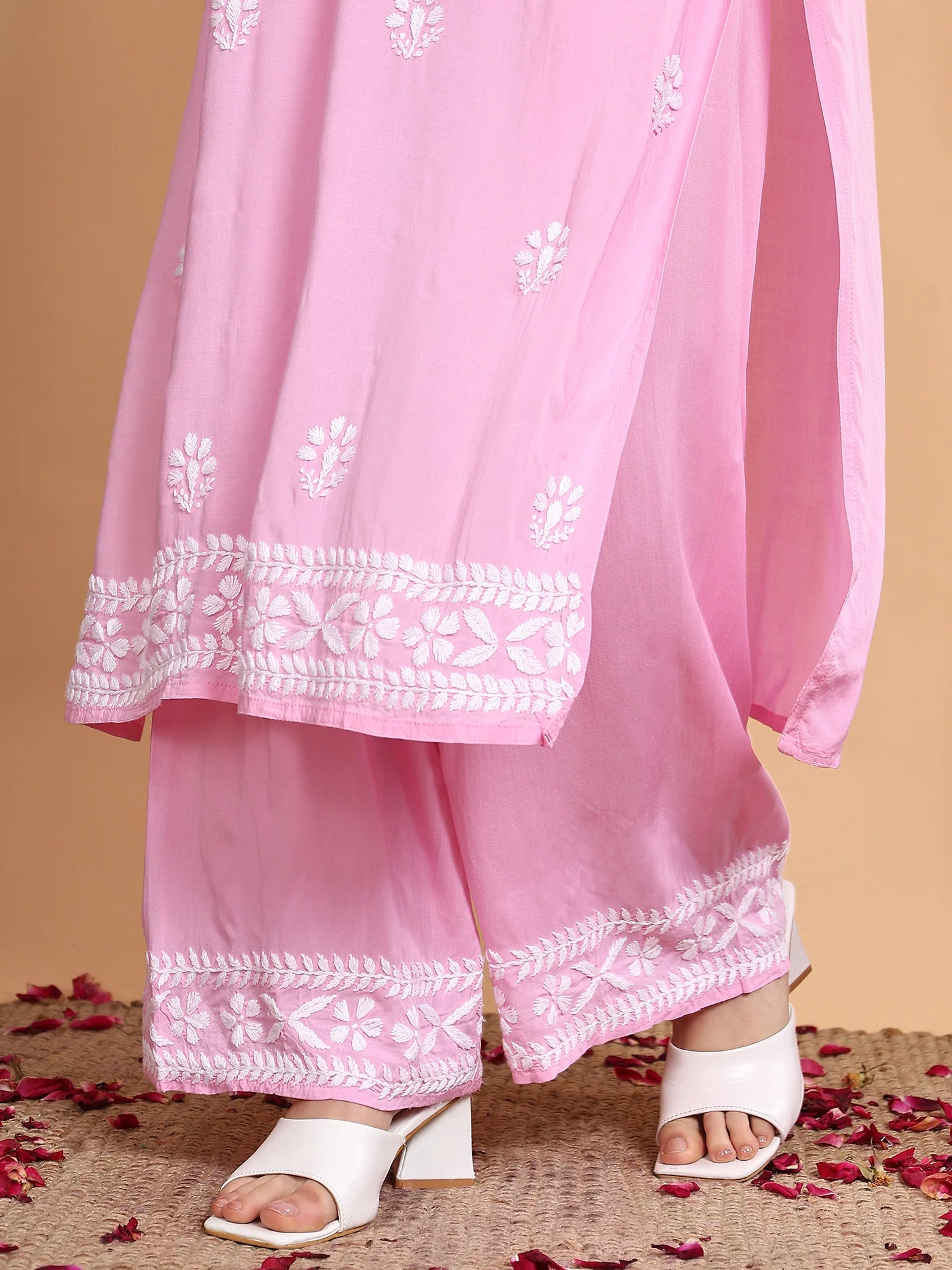 Workmanship: Hand-embroidery Chikankari Work includes Kurta plus palazzo trousers and a duvet.
