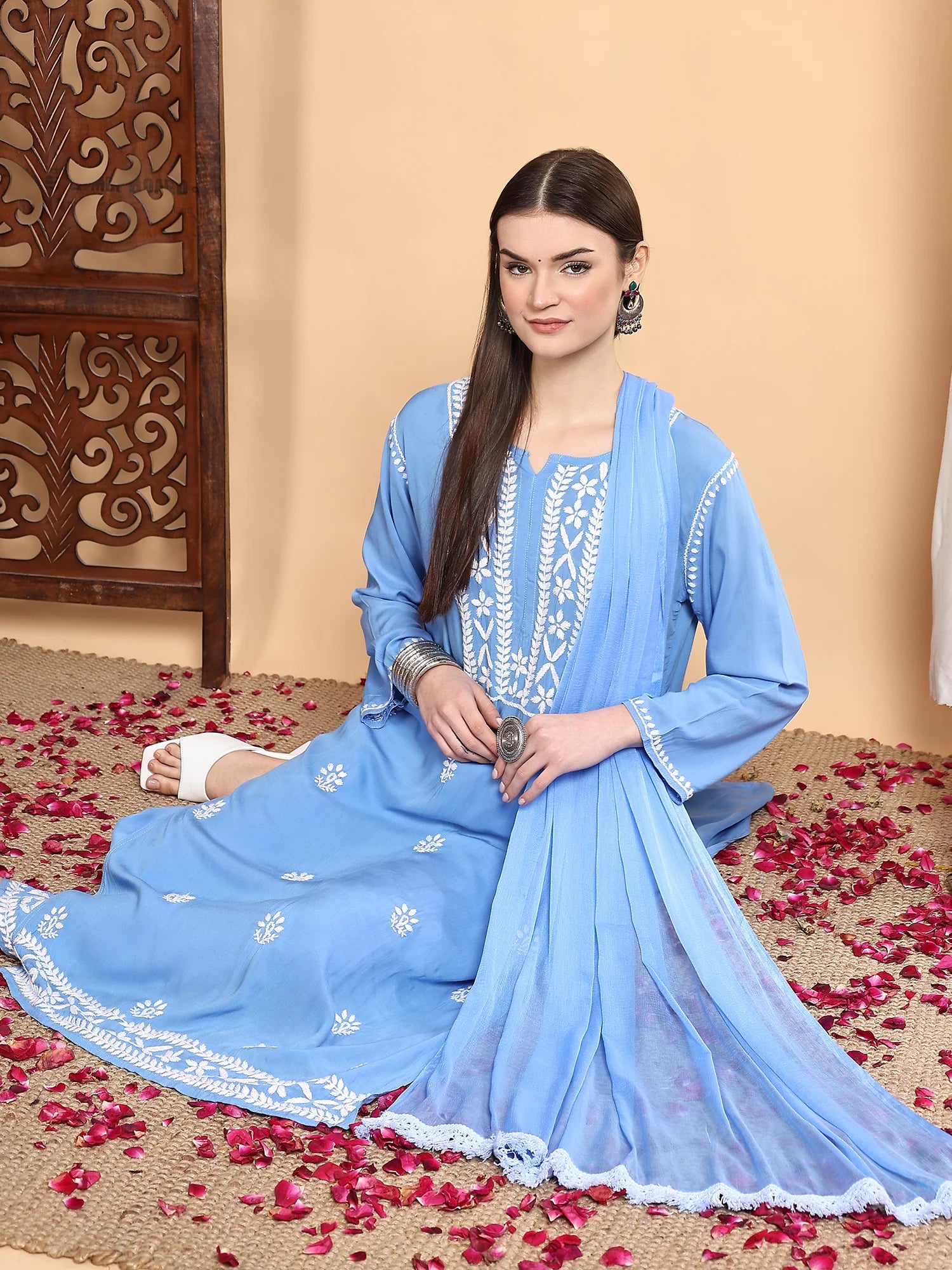 Beautiful handcrafted chikankari embroidery adorns this ensemble, therefore highlighting the rich legacy of Indian creativity. Every thread shows painstaking attention to detail, which accentuates your appearance.