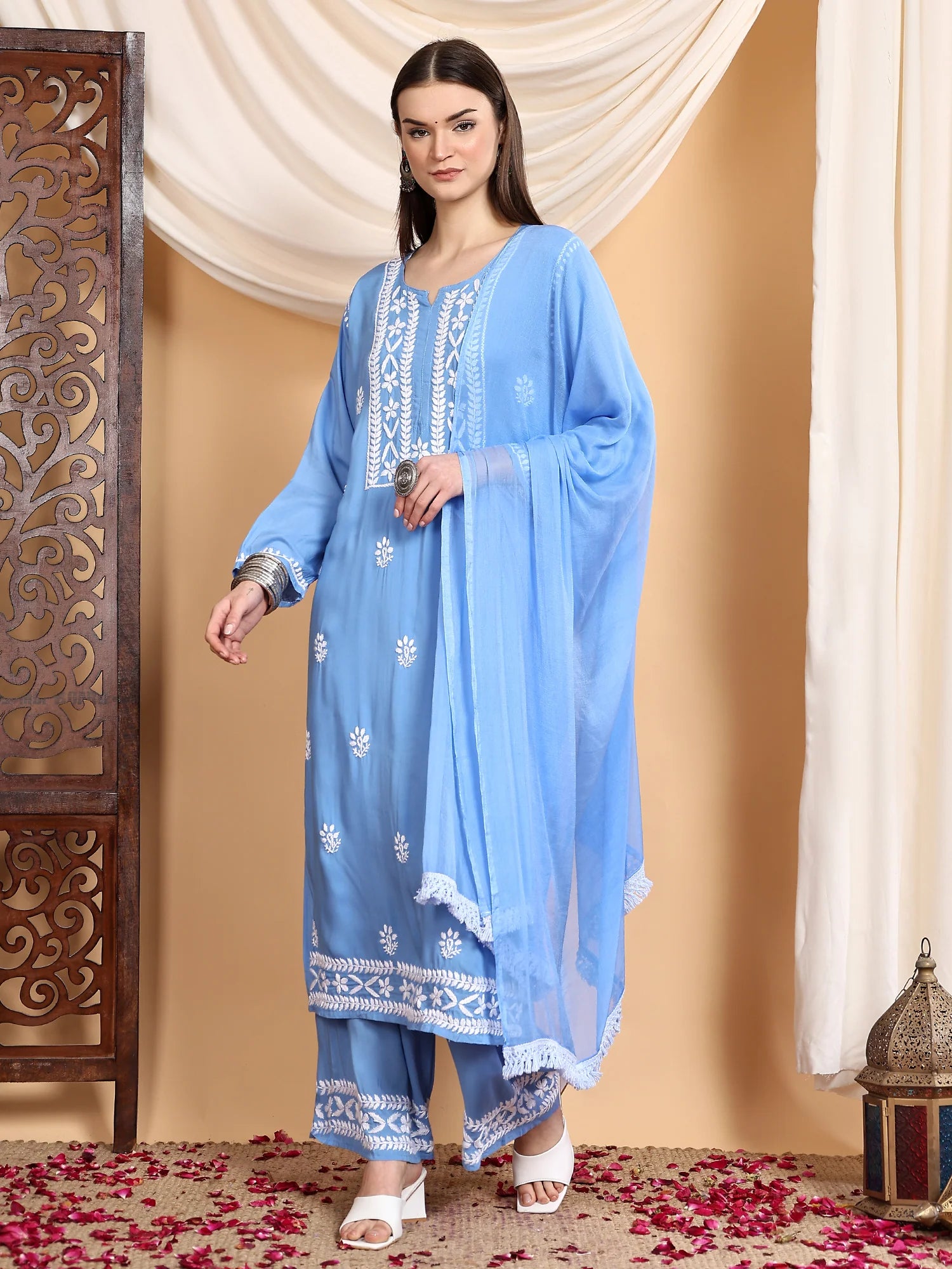 Workmanship: Hand-embroidery Chikankari Work includes Kurta plus palazzo trousers and a duvet.